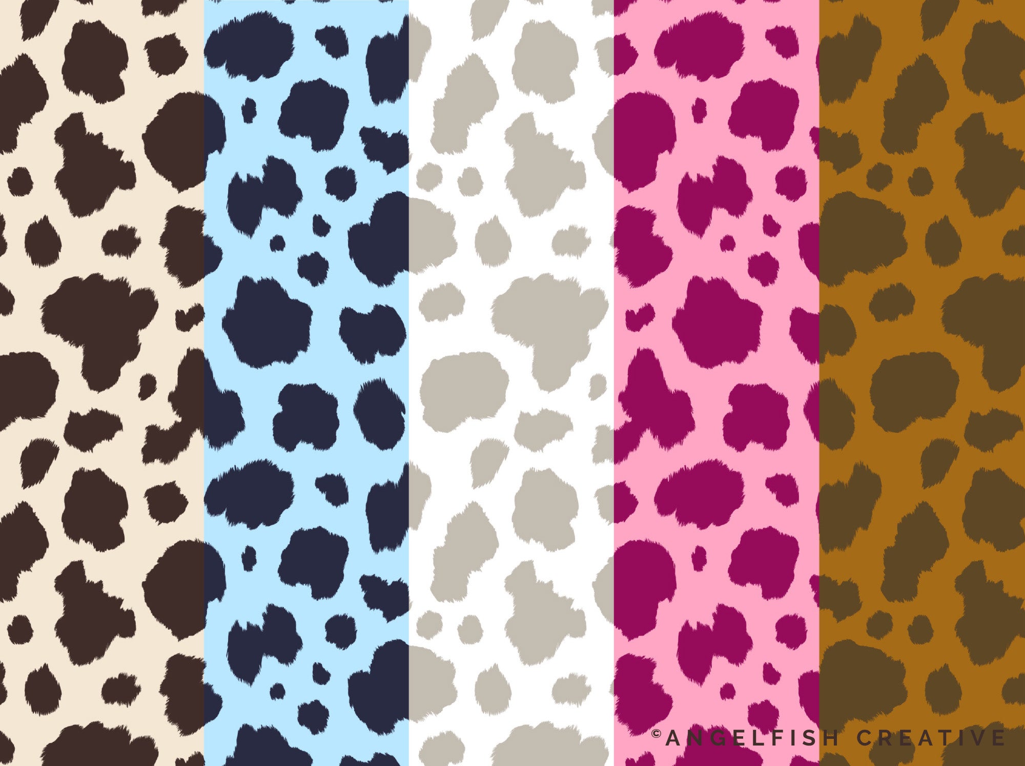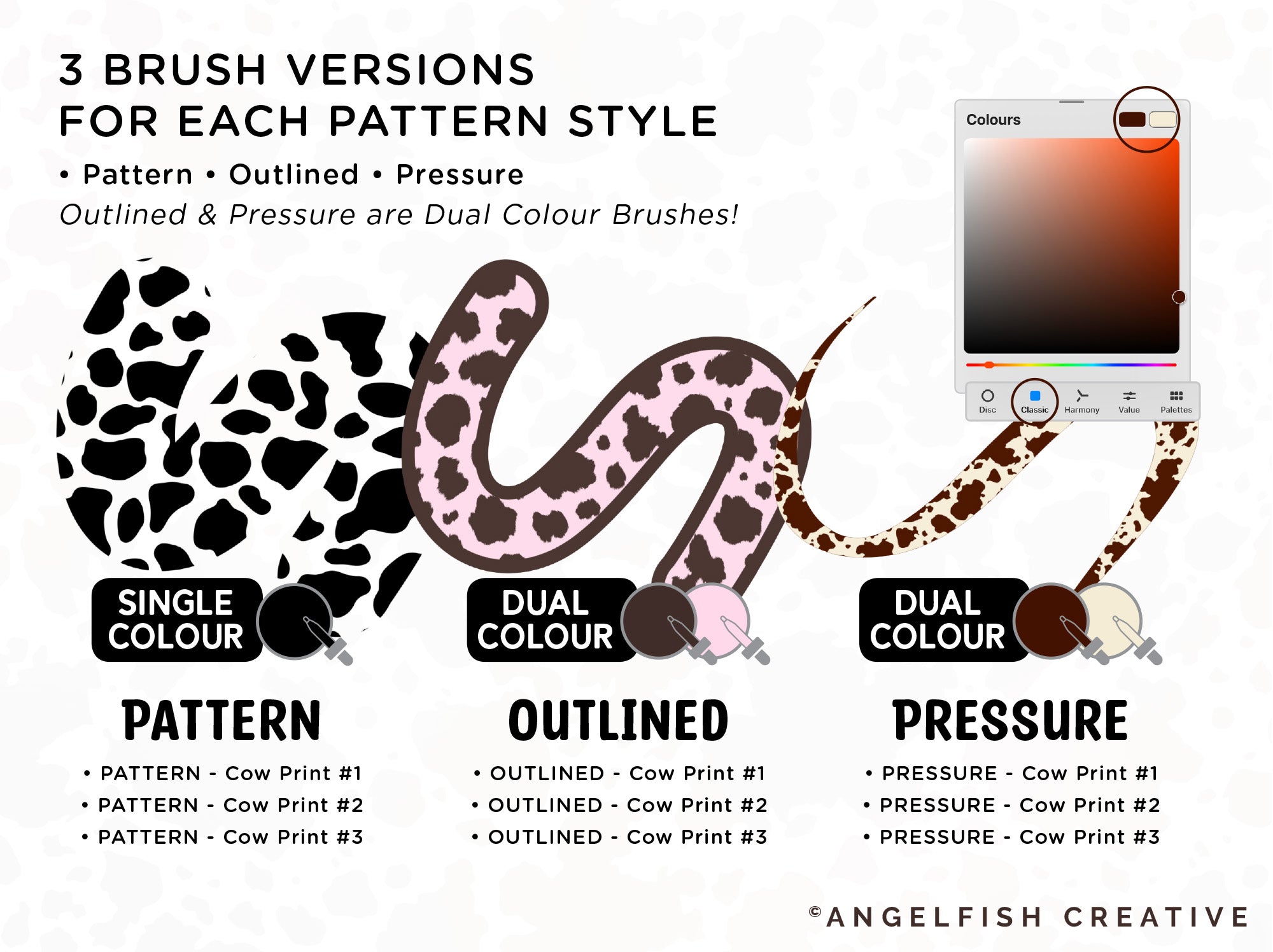 Get your creativity moo-ving and grooving with our Cow Print pattern brushes for Procreate! The set includes 3 cow print pattern styles, with 3 brush versions for each pattern (9 brushes in total). Versatile for all kinds of art and lettering projects!