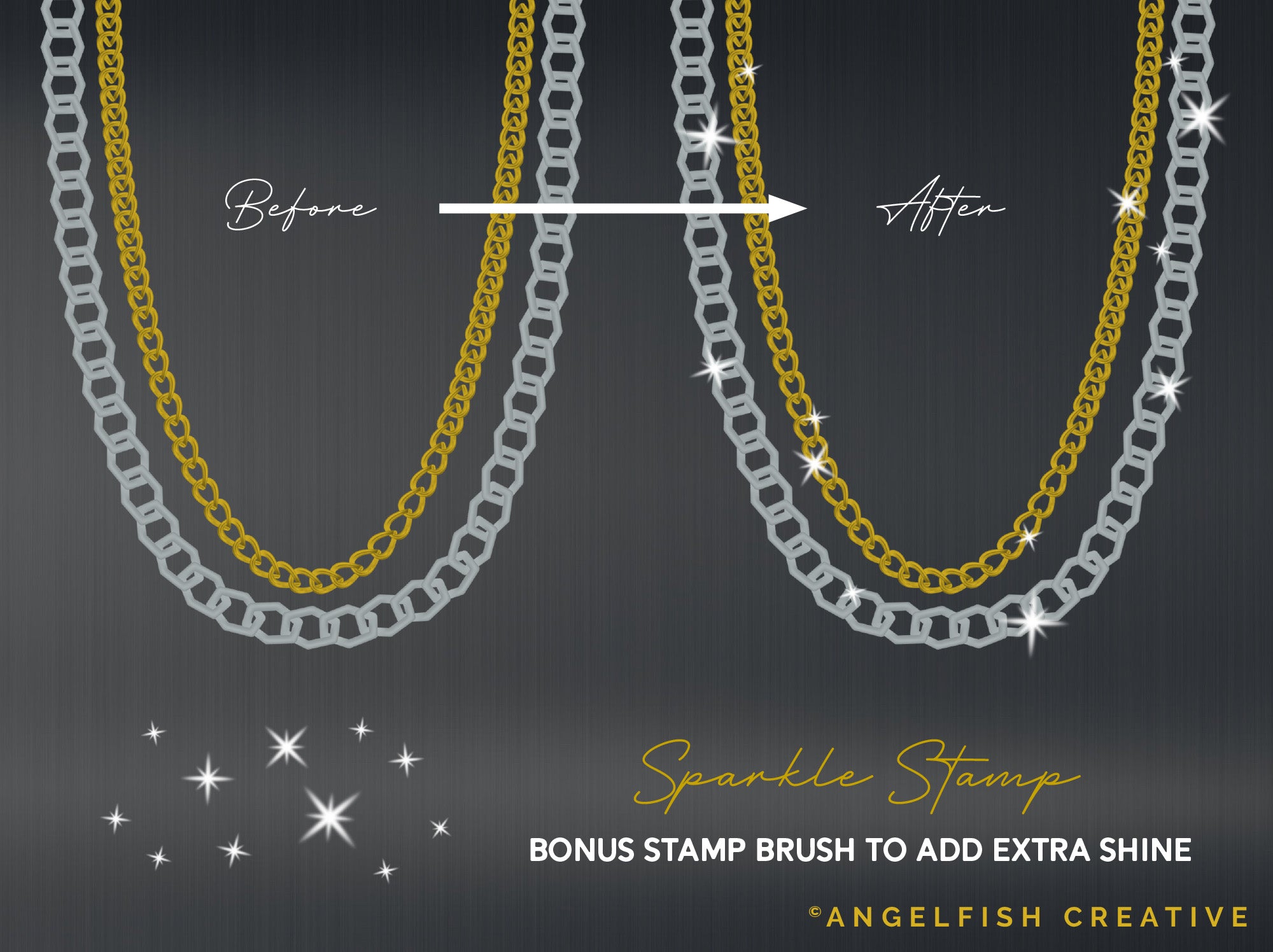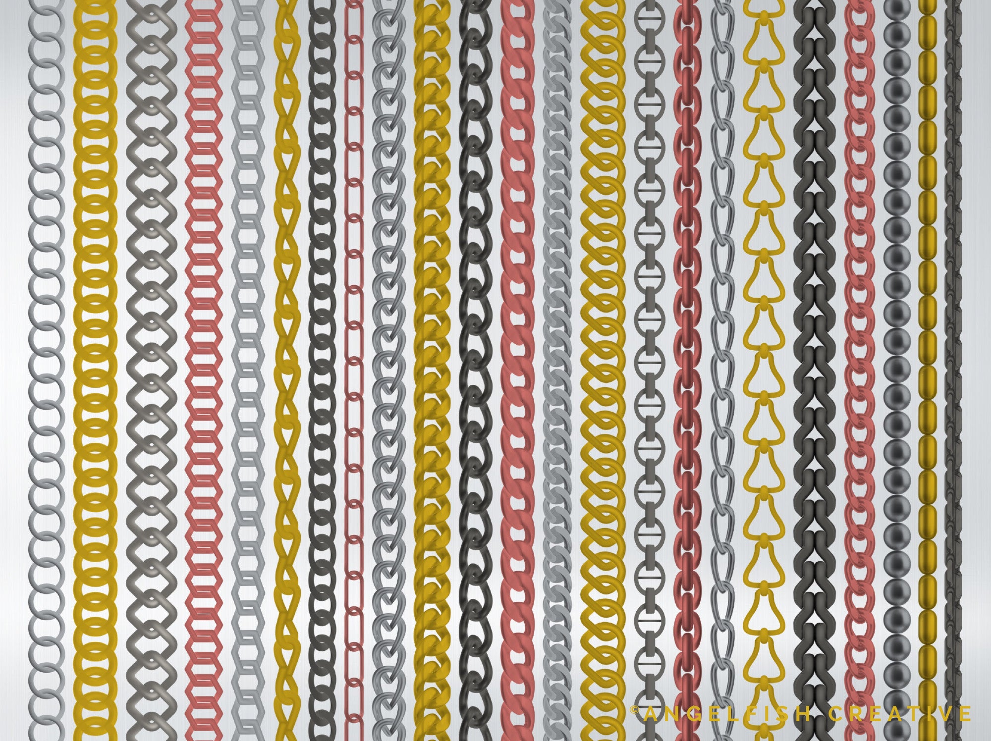 Add some metal links to your next artwork piece with our METAL CHAINS brush set for Procreate. With 50 different brush designs, there are a variety of chains styles to create jewellery designs with, along with 2 metal inspired colour palettes plus a bonus sparkle stamp to add extra shine.