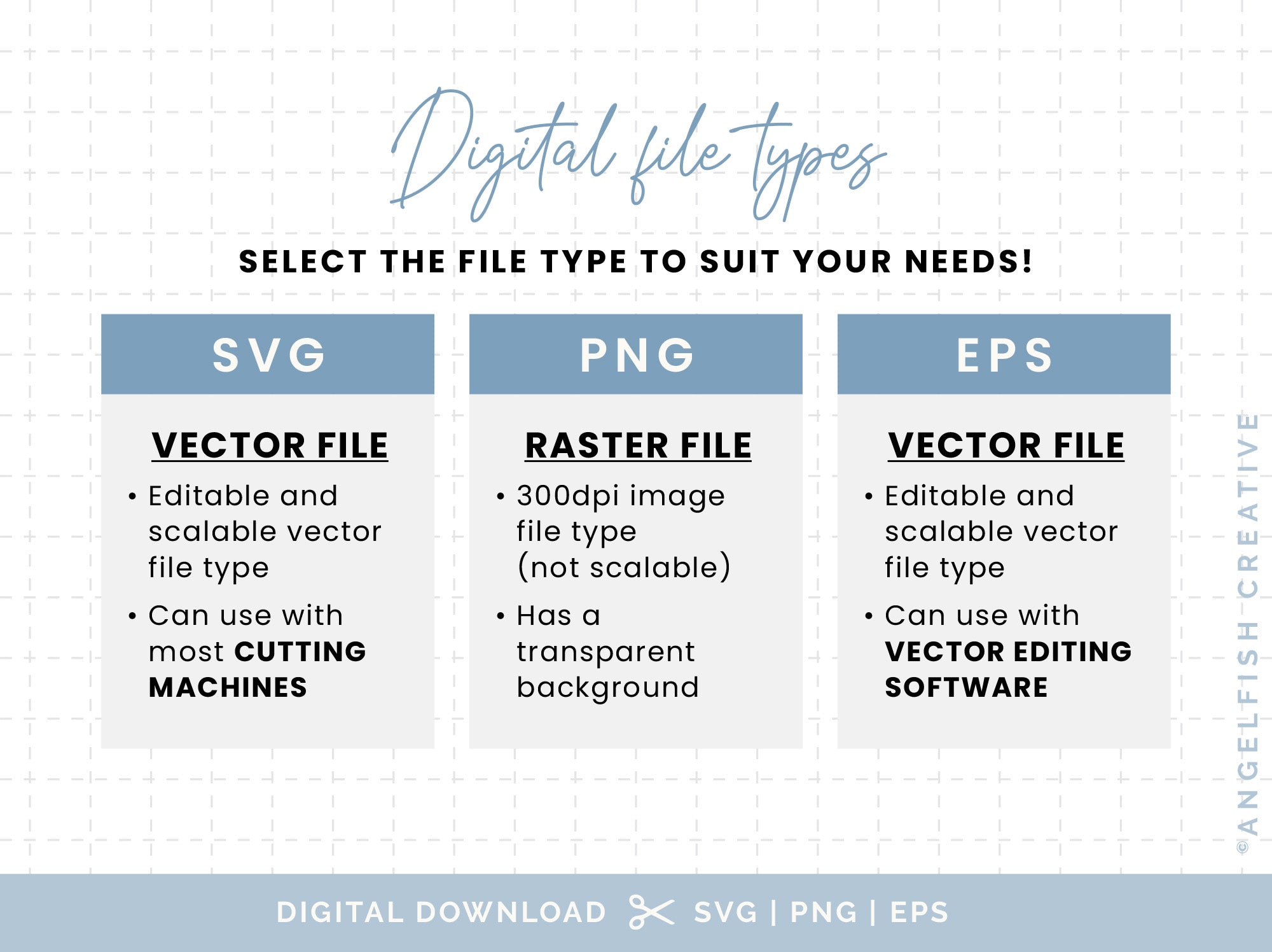 These files are for personal or small home business use only. Do not claim these SVG/PNG/EPS files as your own, copy, alter, share or resell these files in any form. Copyright stays with Angelfish Creative. You can view the full Creative License included with this product here.