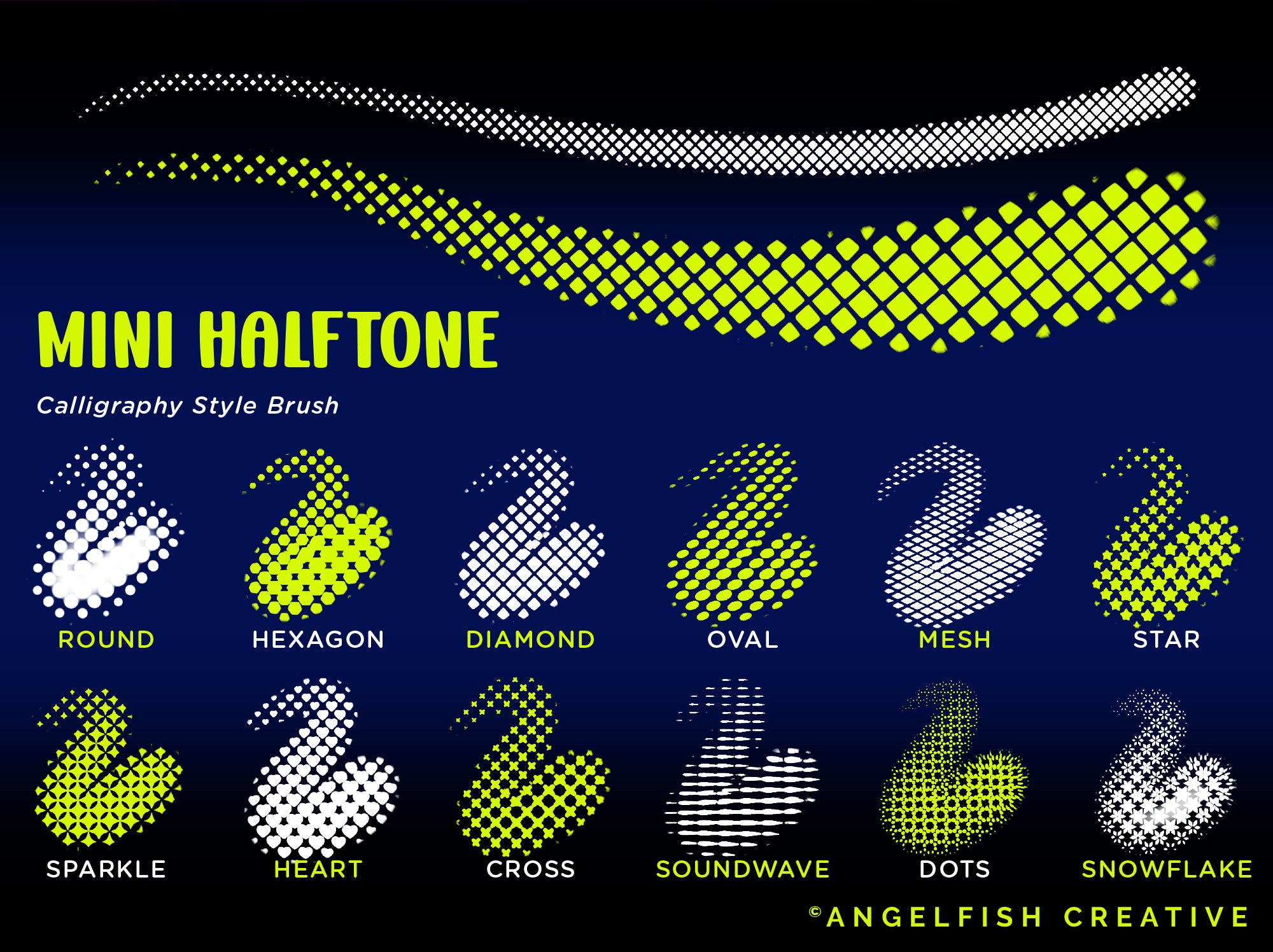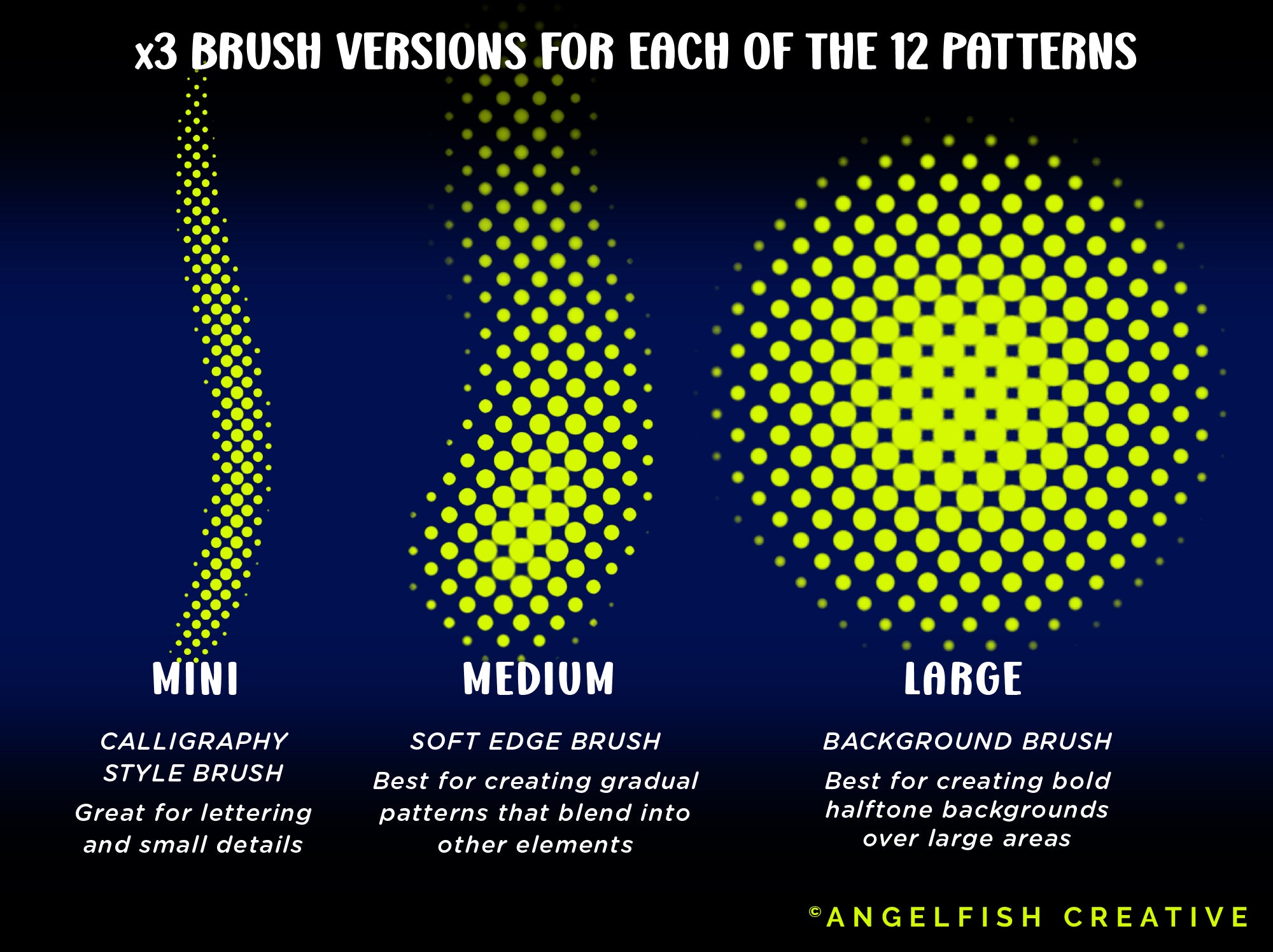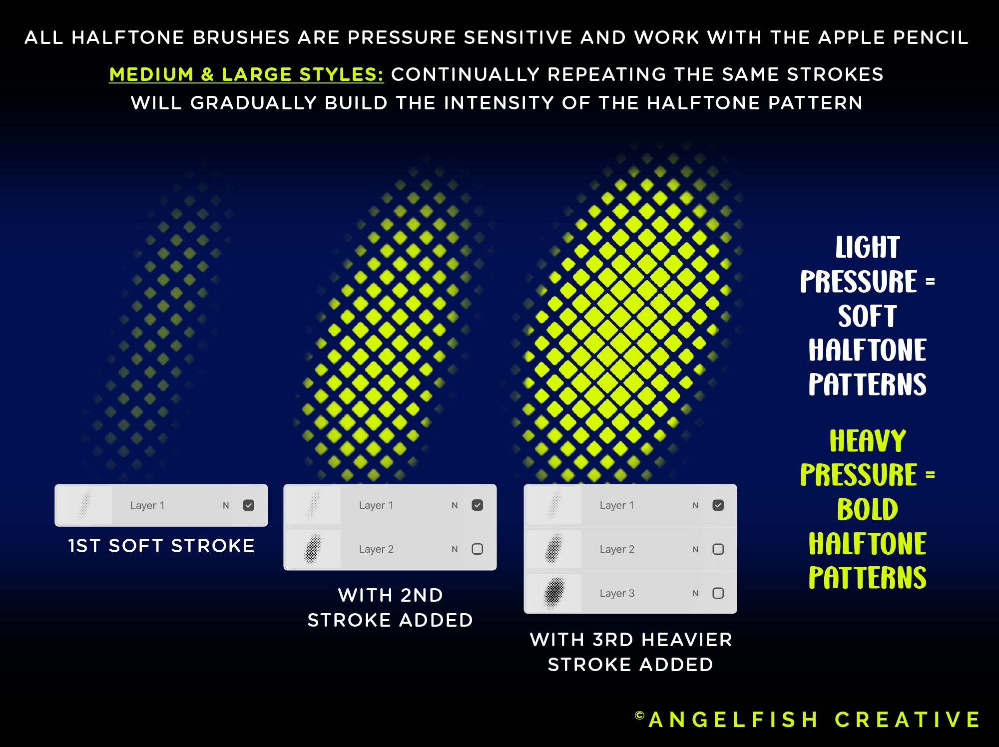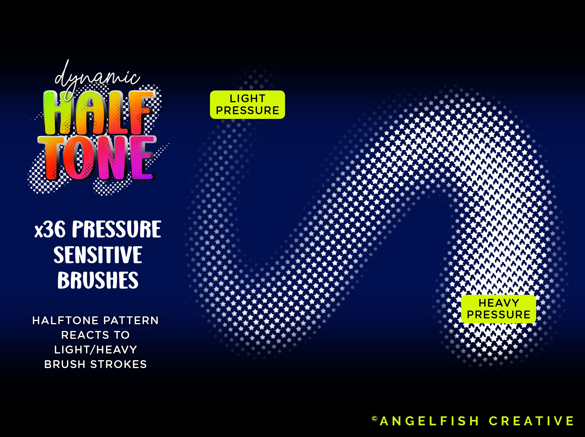 Add halftone details to your next design with our DYNAMIC HALFTONE brushes for Procreate. These specially designed brushes react to light and heavy brush strokes, allowing you to have control of the intensity of the halftone pattern - great for adding texture, lettering or creating a comic book masterpiece!